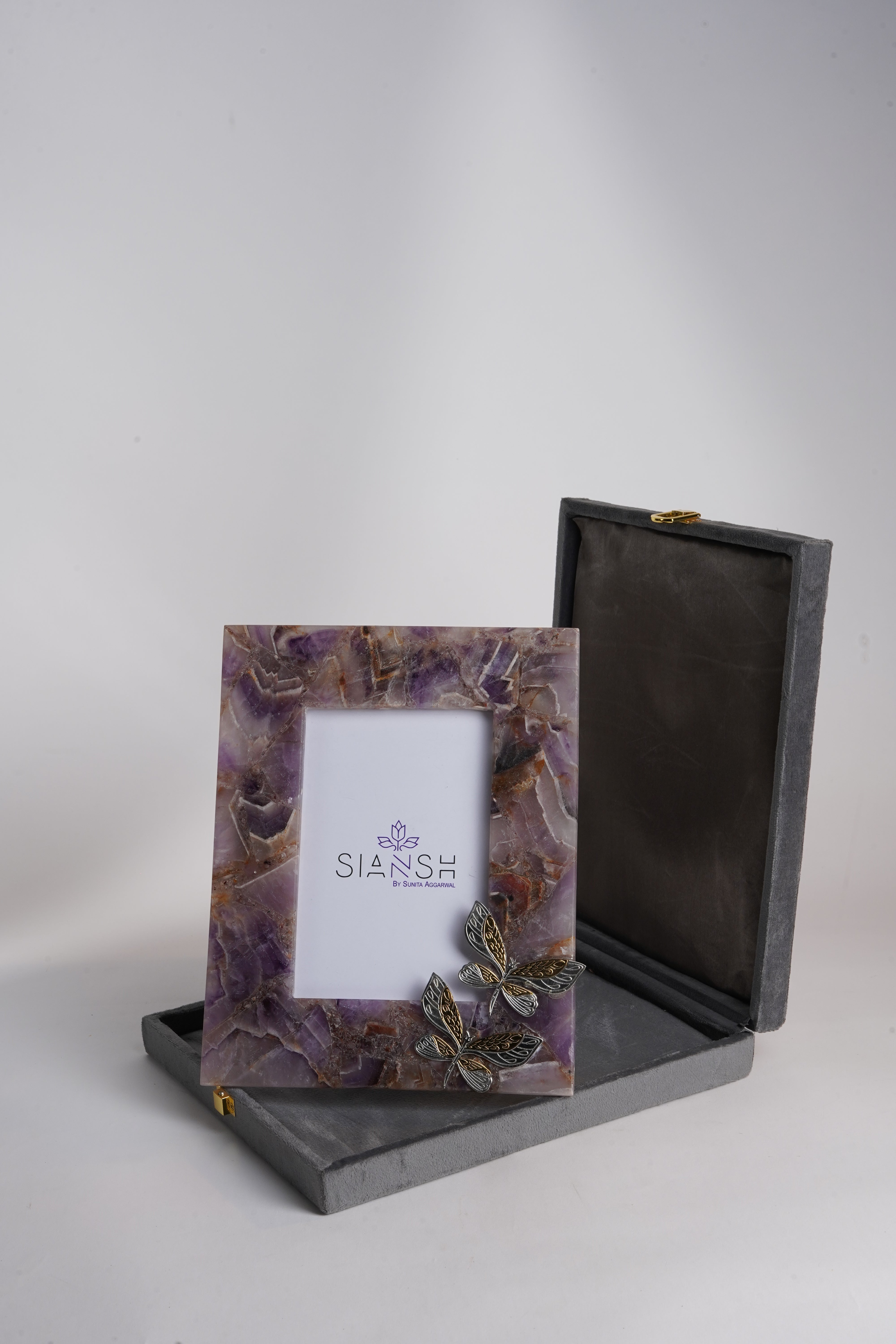 Add a touch of natural elegance to your décor with the Amethyst Photo Frame by Siansh by Sunita Aggarwal. Made from authentic amethyst stone, this frame is adorned with delicately crafted silver-plated butterflies on brass, bringing charm and sophistication to your space. The rich purple tones of the stone make it a standout decorative accent. Ideal for gifting, home décor, or office tables, this 10x9 inch frame is beautifully packed in a Swede utility box, perfect for festivals, weddings, baby announcements, or corporate gifting.