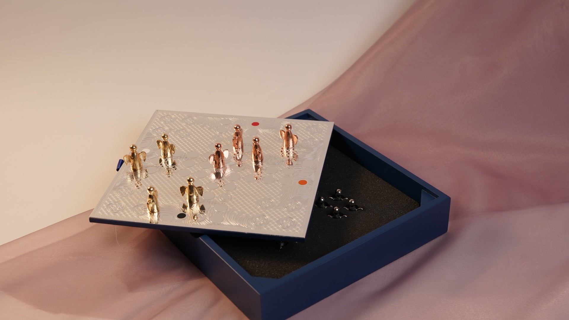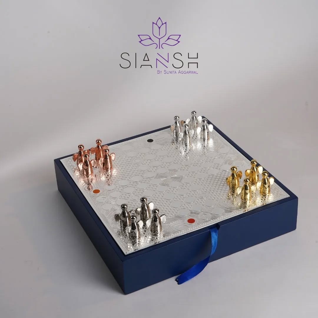 Add a royal twist to your game nights with this handcrafted silver-plated Ludo board, featuring finely polished brass tokens in elegant gold, rose gold, and silver tones. The play surface is intricately engraved, offering a luxurious visual texture that blends traditional Indian design with modern elegance. Perfect for festive gifting, décor display, or as a conversation-starting centerpiece, this Ludo set comes nestled in a premium swede-lined utility box—ideal for weddings, corporate gifts, or heirloom collectors.