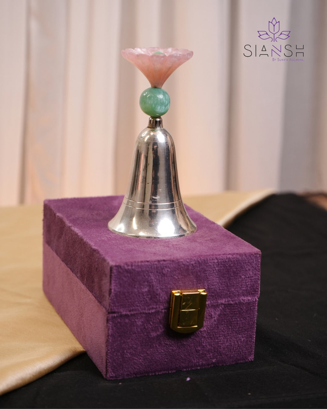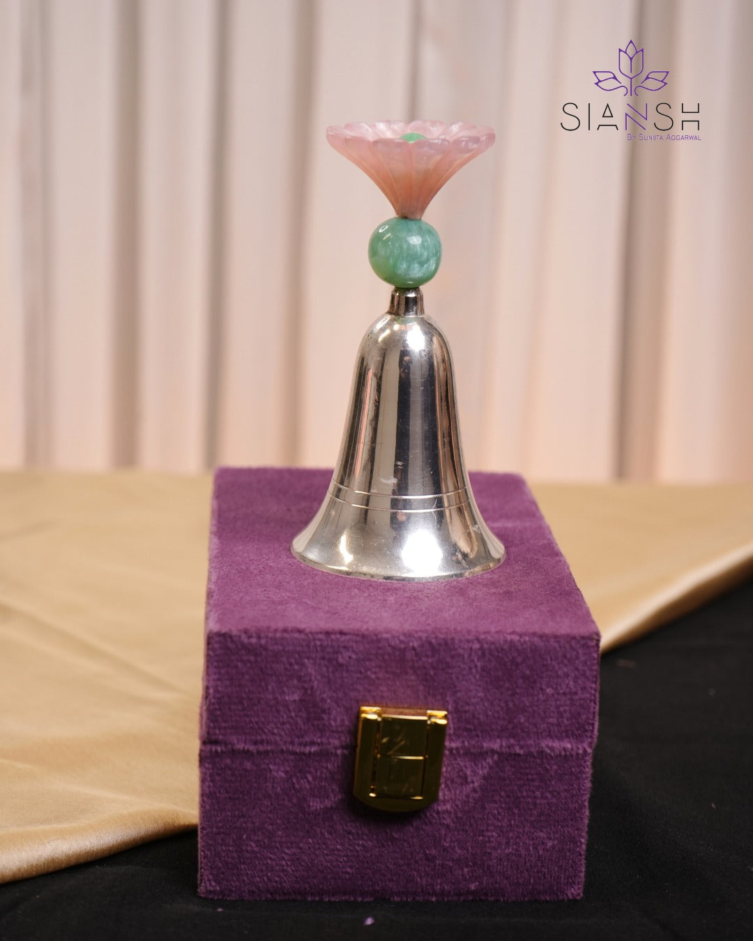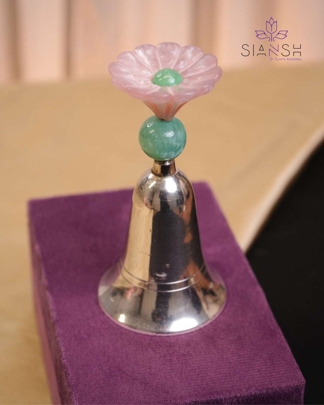 - Design: On top of the bell, there's a pink rose quartz flower with delicate petals and a green gemstone center.