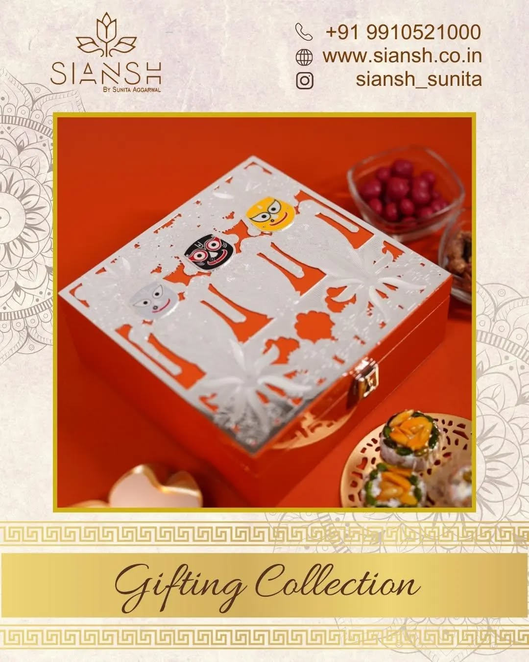 Celebrate tradition with a modern twist using the Enameled Jagannath Multi-Purpose Box by Siansh by Sunita Aggarwal. Crafted from high-quality brass with silver plating, this box features detailed engraving and colorful enamel art of Lord Jagannath, Balabhadra, and Subhadra. The vibrant orange base makes it a standout piece for festive gifting, sweets, jewelry storage, or as a divine console artifact. Comes in a premium Swede utility box, making it a perfect return gift or spiritual keepsake for Diwali, Rath Yatra, or housewarming celebrations.
