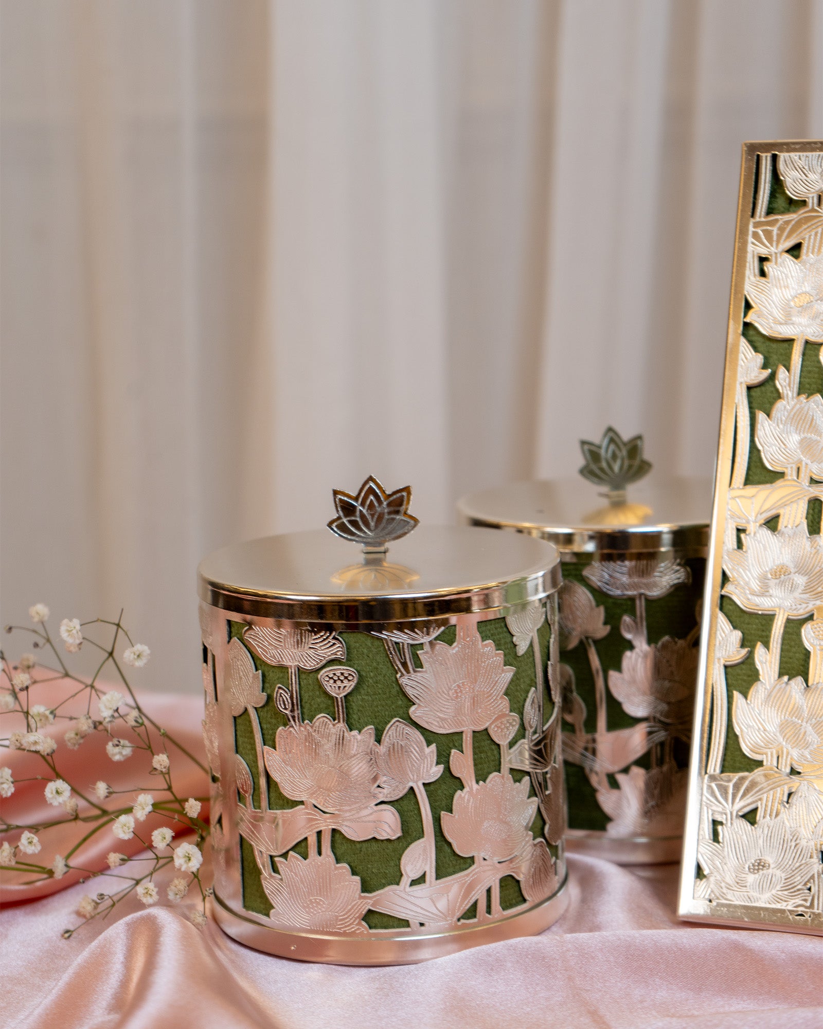 Crafted with fine silver plating, the intricate lotus-inspired detailing exudes timeless beauty, making it an ideal choice for those who appreciate luxury home decor. Packaged in a plush velvet box, this designer silver gift set is sure to impress and leave a lasting impression.