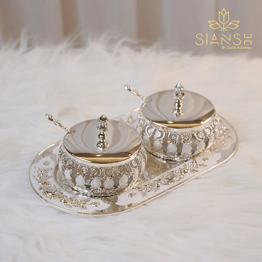Whether you're looking for a premium gift for weddings, housewarmings, or festive occasions, this decorative serveware is sure to impress. A must-have for luxury home décor, this set beautifully complements your dining table, pooja room, or coffee table setup.