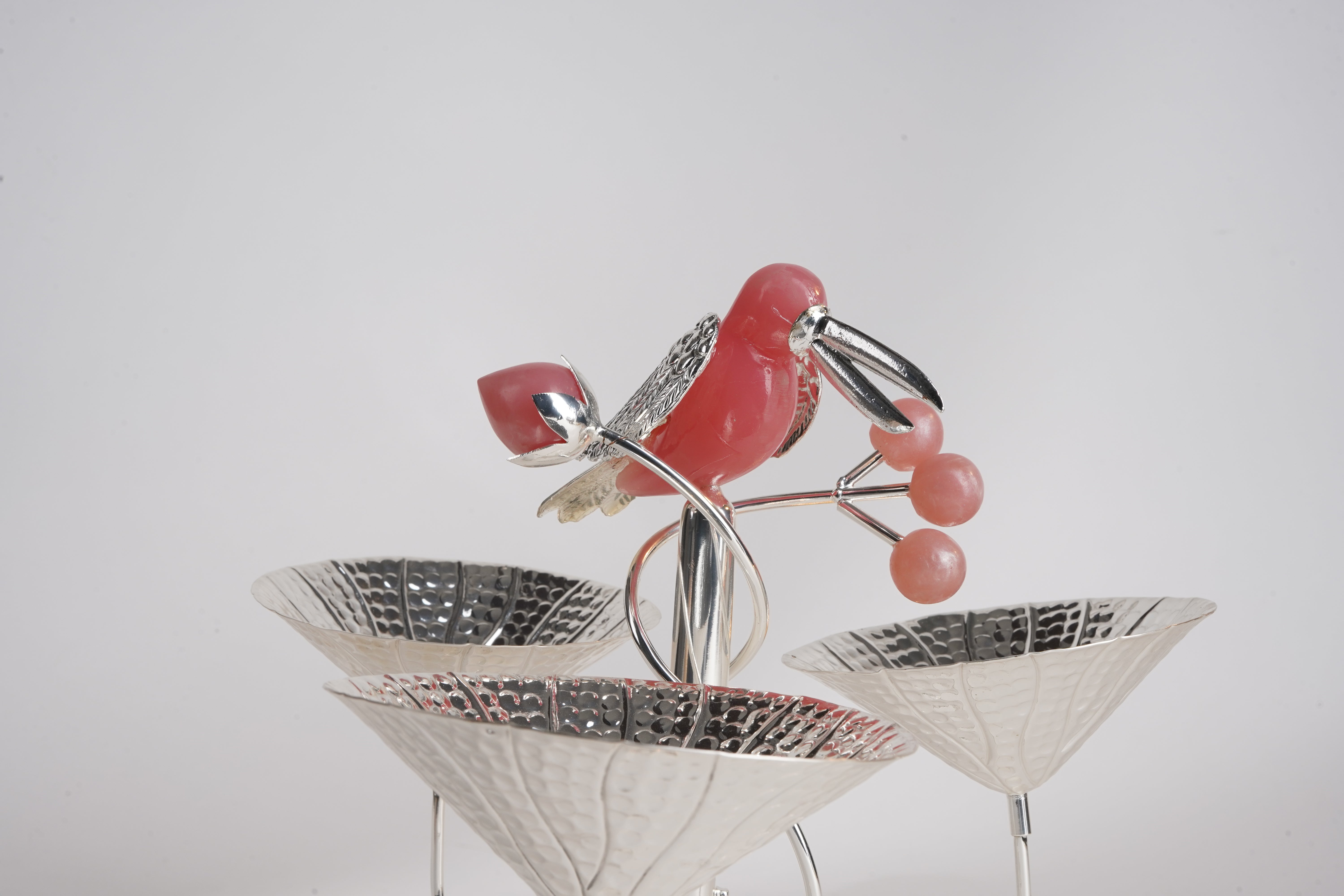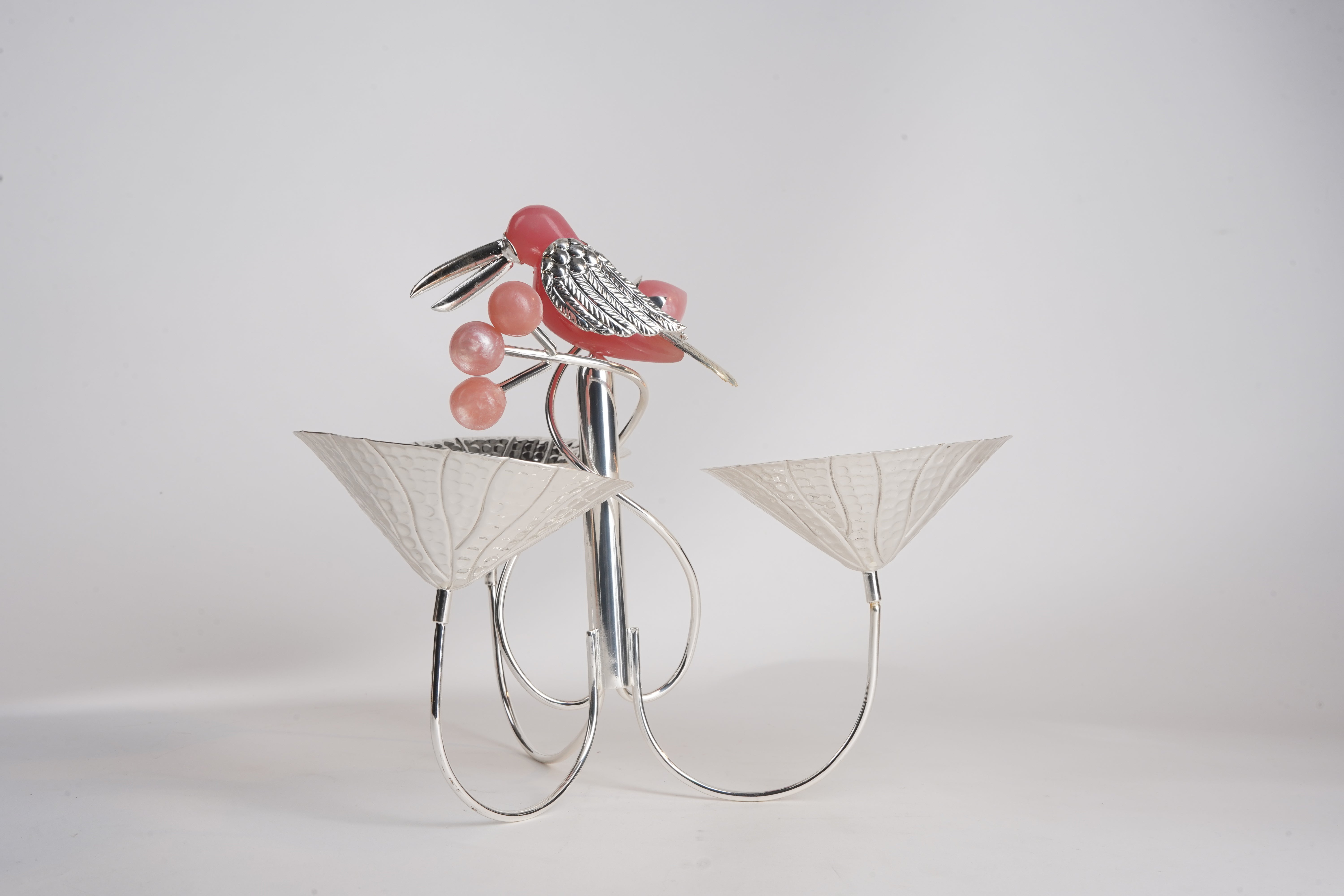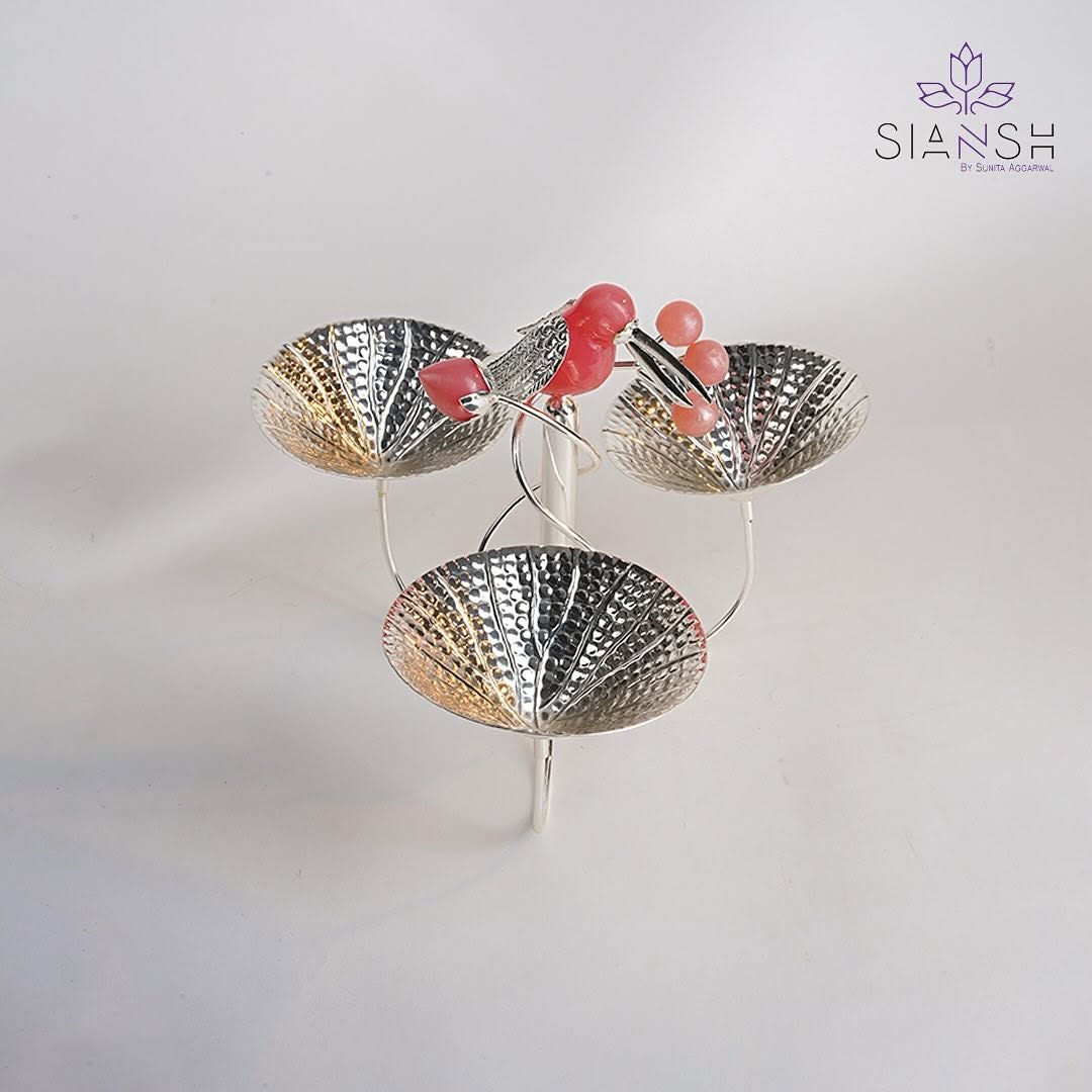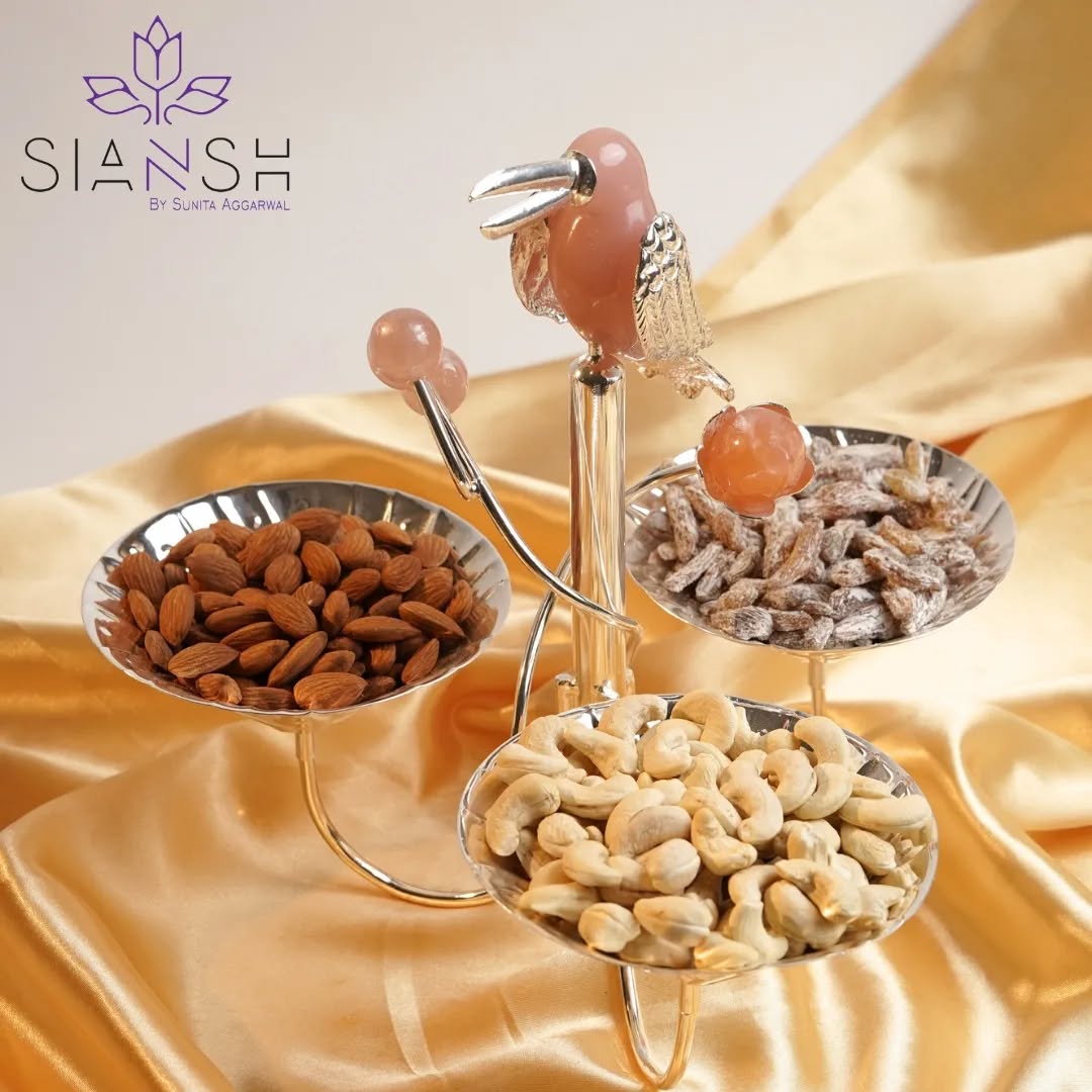 Add a touch of luxury and elegance to your dining experience with this silver-plated Toucan 3-Bowl Platter. Featuring an intricately designed Toucan bird with gemstone detailing, this statement serveware piece is perfect for serving dry fruits, nuts, sweets, or gourmet snacks.
