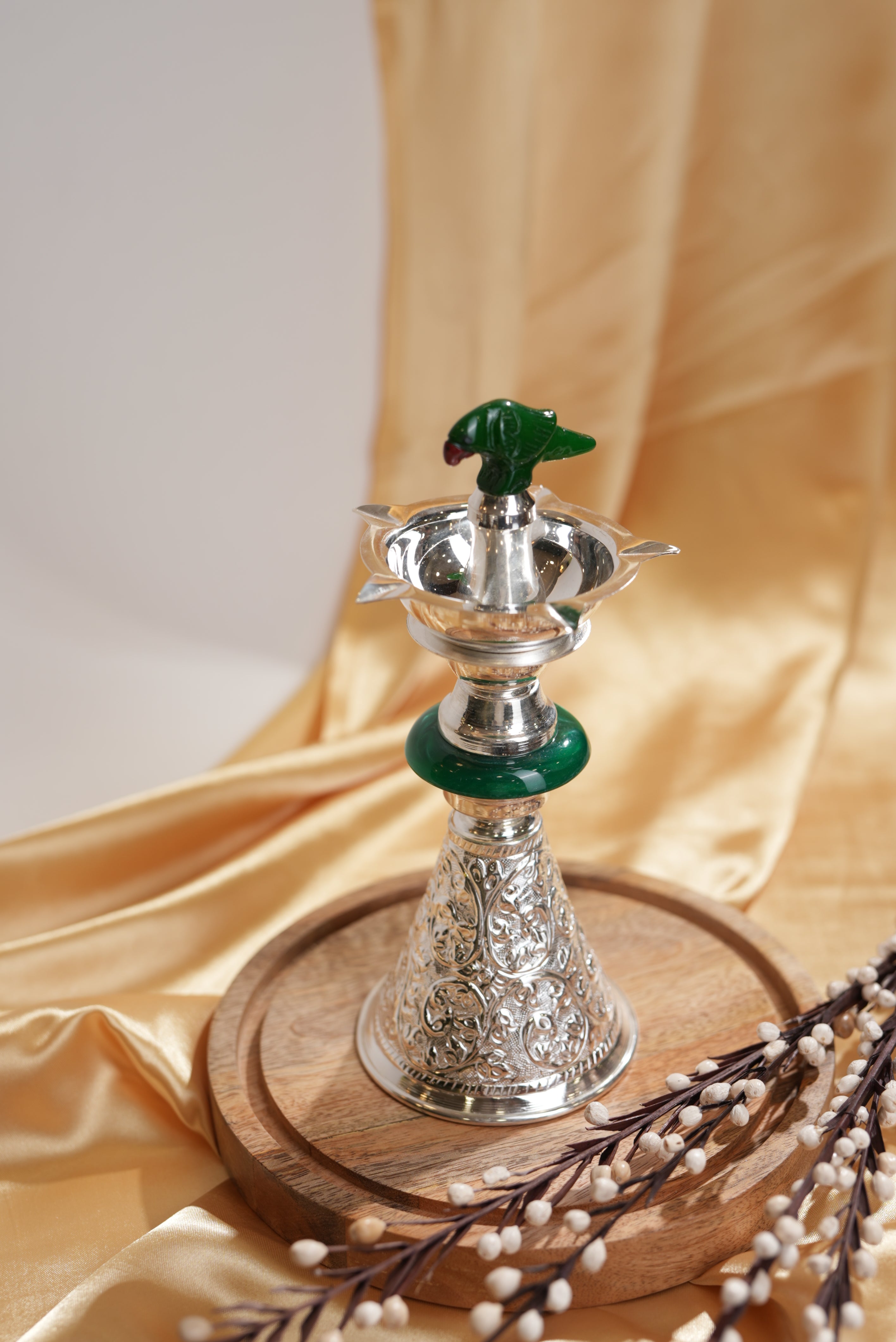 Add a touch of tradition and elegance to your space with this intricately designed silver-plated samai. Featuring a beautifully carved conical base, rich green detailing, and a unique parrot-shaped handle, this decorative piece is both functional and eye-catching. Perfect for home decor, spiritual rituals, or as a thoughtful gift. Set atop a stylish wooden platform, it blends cultural charm with modern luxury. Ideal for enhancing living rooms, meditation spaces, or ceremonial settings.