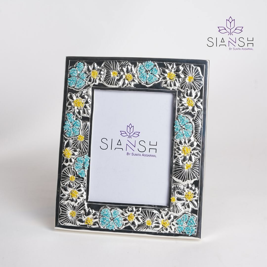 Celebrate your cherished memories with this 10x9 inch silver-plated photo frame, exquisitely handcrafted on brass with vibrant floral detailing. Adorned with turquoise blue and sunny yellow enamel accents, its intricate design brings together elegance and joy—making it a perfect match for any décor style. Whether gifted during weddings, anniversaries, or festivals, or used to frame your favorite moments at home, this frame adds timeless charm. Packed in a rich swede utility box, it's as thoughtful as it is beautiful.