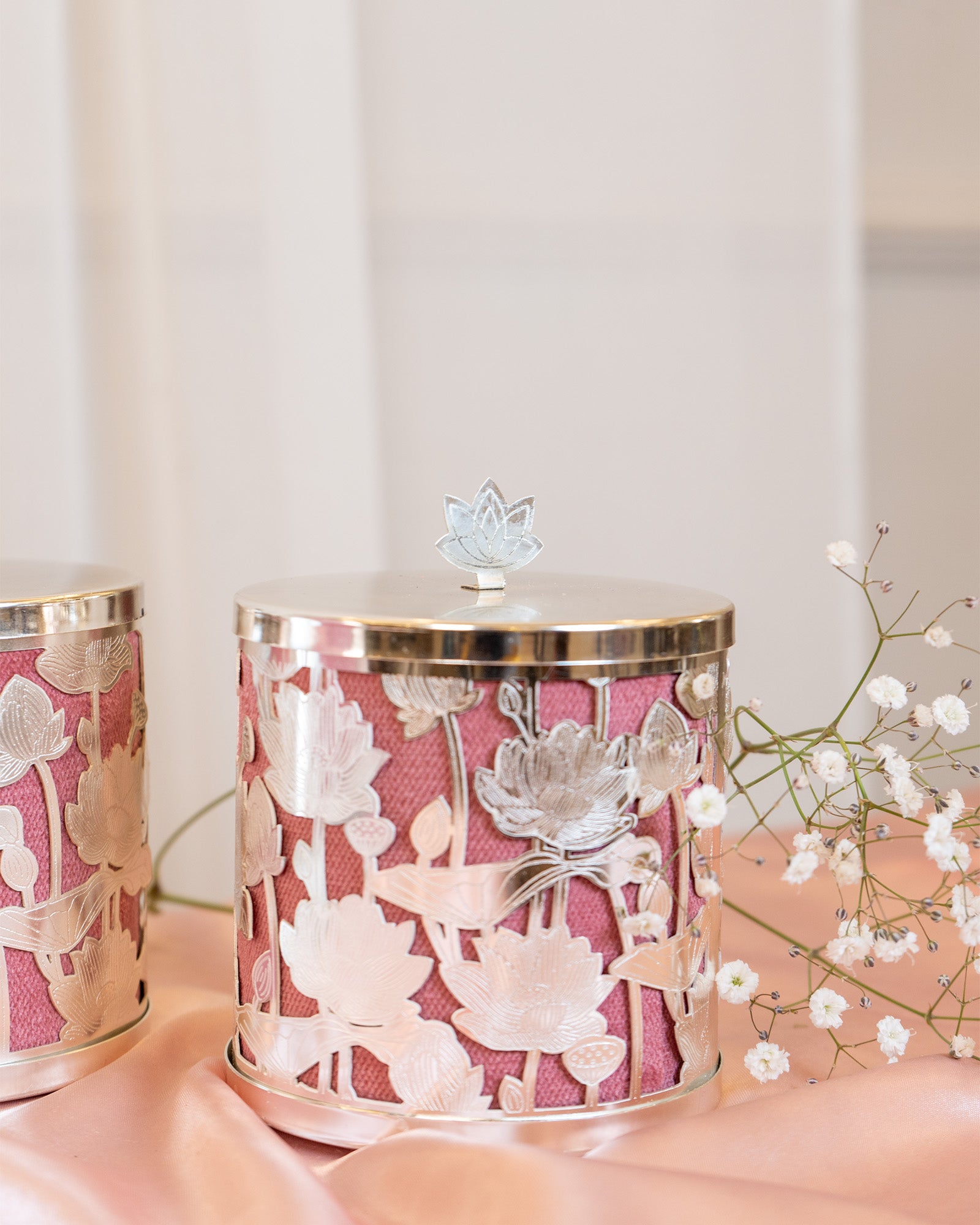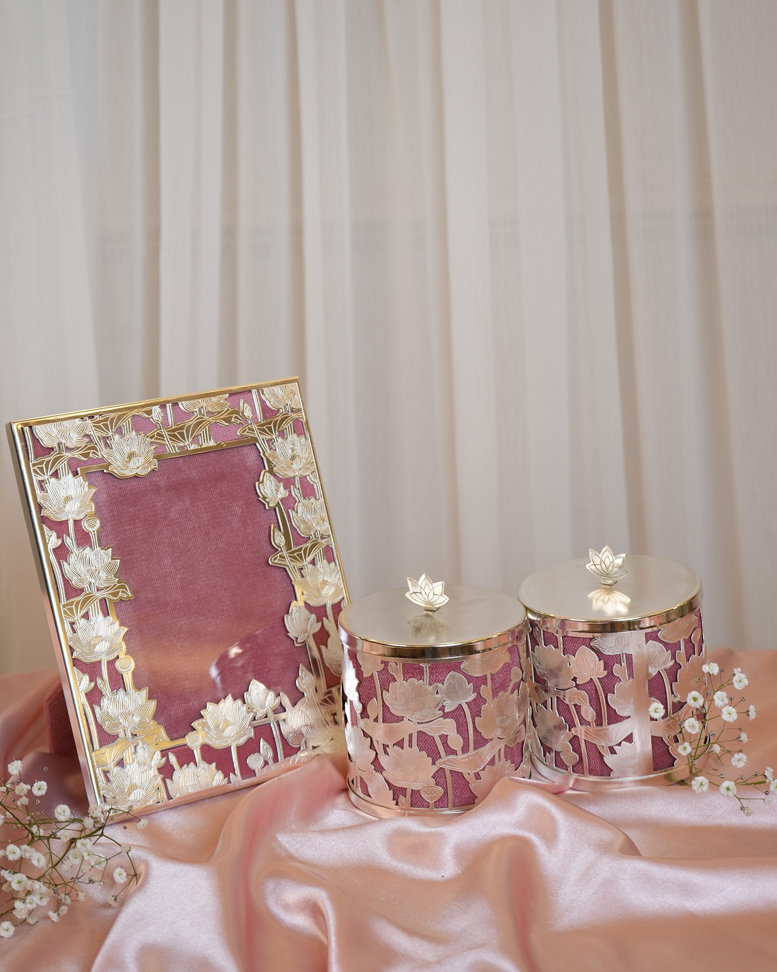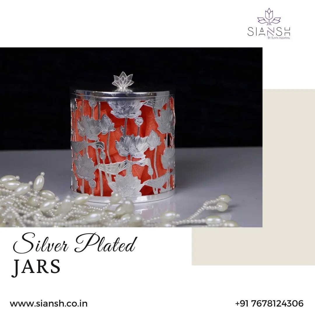 Elevate your gifting experience with this exquisite silver-plated gift set, featuring a beautifully crafted photo frame and two decorative storage jars. Designed with intricate lotus motifs, this set blends traditional artistry with modern elegance, making it a perfect luxury gift for weddings, housewarmings, anniversaries, and festive celebrations.