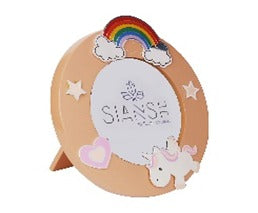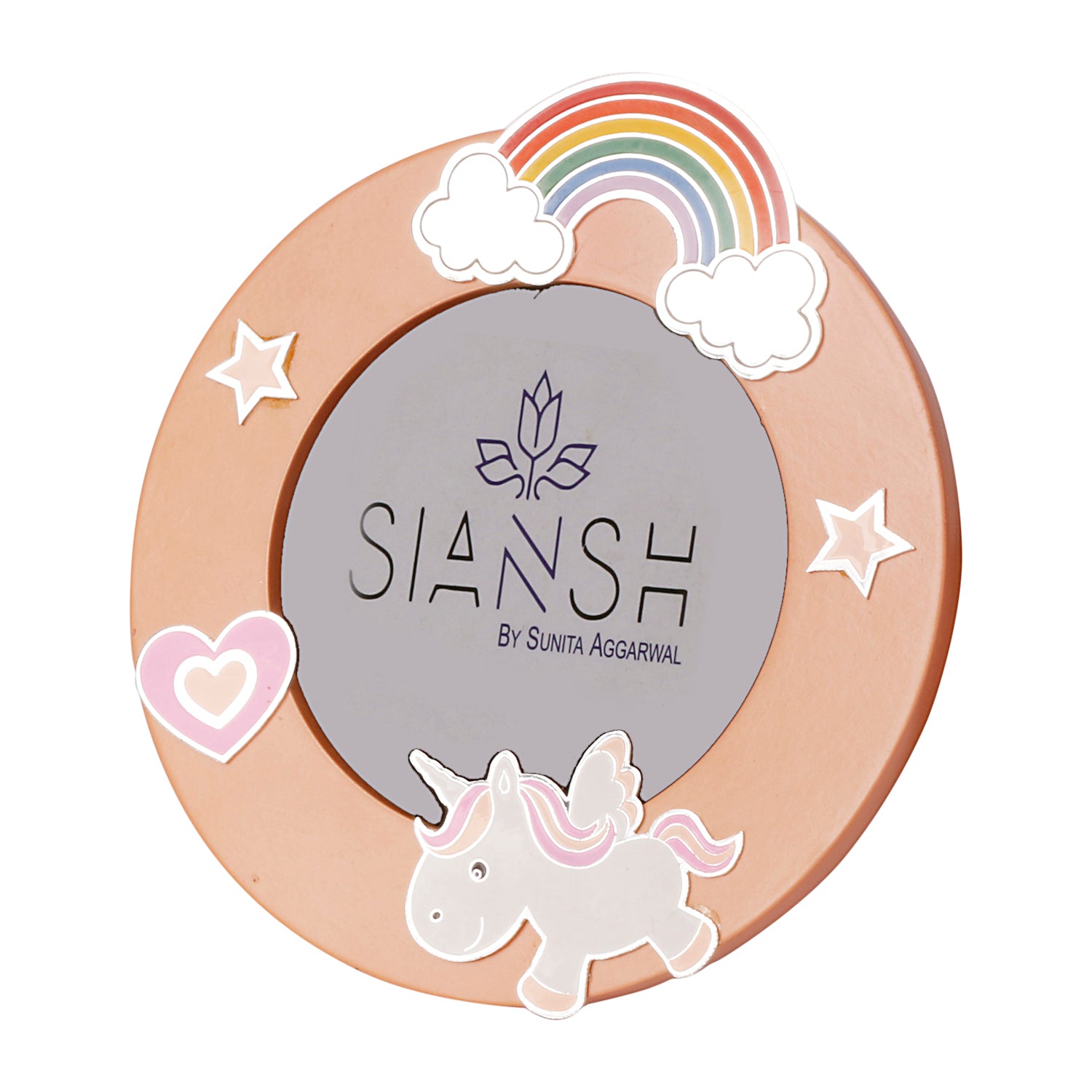 Celebrate childhood memories with this Pink Baby Photo Frame, beautifully crafted in silver-plated brass and adorned with a whimsical unicorn, rainbow, and heart-themed enamel décor. With a charming circular design (6-inch diameter), it’s the perfect keepsake to capture your little one’s precious milestones. Ideal for baby showers, naming ceremonies, or 1st birthday gifts, this frame brings joy and elegance to any nursery or tabletop. Comes in a premium swede utility box—ready to be gifted with love.