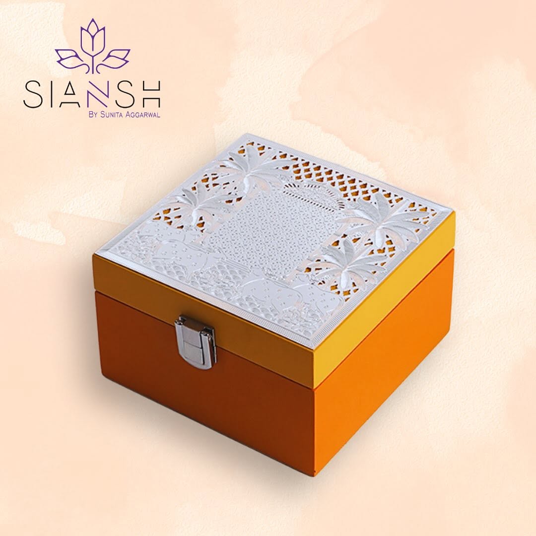 Ideal for storing sweets, dry fruits, jewelry, or rakhi gifts, this compact yet statement-worthy piece makes for a thoughtful festive gift or table accent. The box is finished with a vibrant orange-yellow dual-tone deco base and comes in a premium Swede utility gift box.