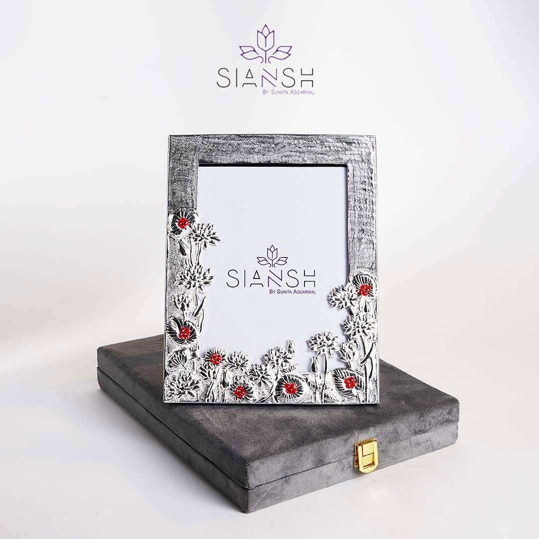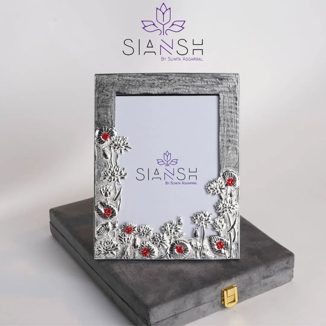 Add a classic charm to your space with this beautifully crafted Silver Plated Photo Frame with Stones by Siansh by Sunita Aggarwal. Made from premium brass and finished with intricate silver plating, this 10x9 inch frame features a delicate floral motif inlaid with red beads, creating a luxurious yet artistic look. Whether you're framing cherished memories or gifting for weddings, anniversaries, baby showers or corporate events, this frame adds the perfect touch of elegance. Comes securely packed in a Swede utility box, ready to impress.