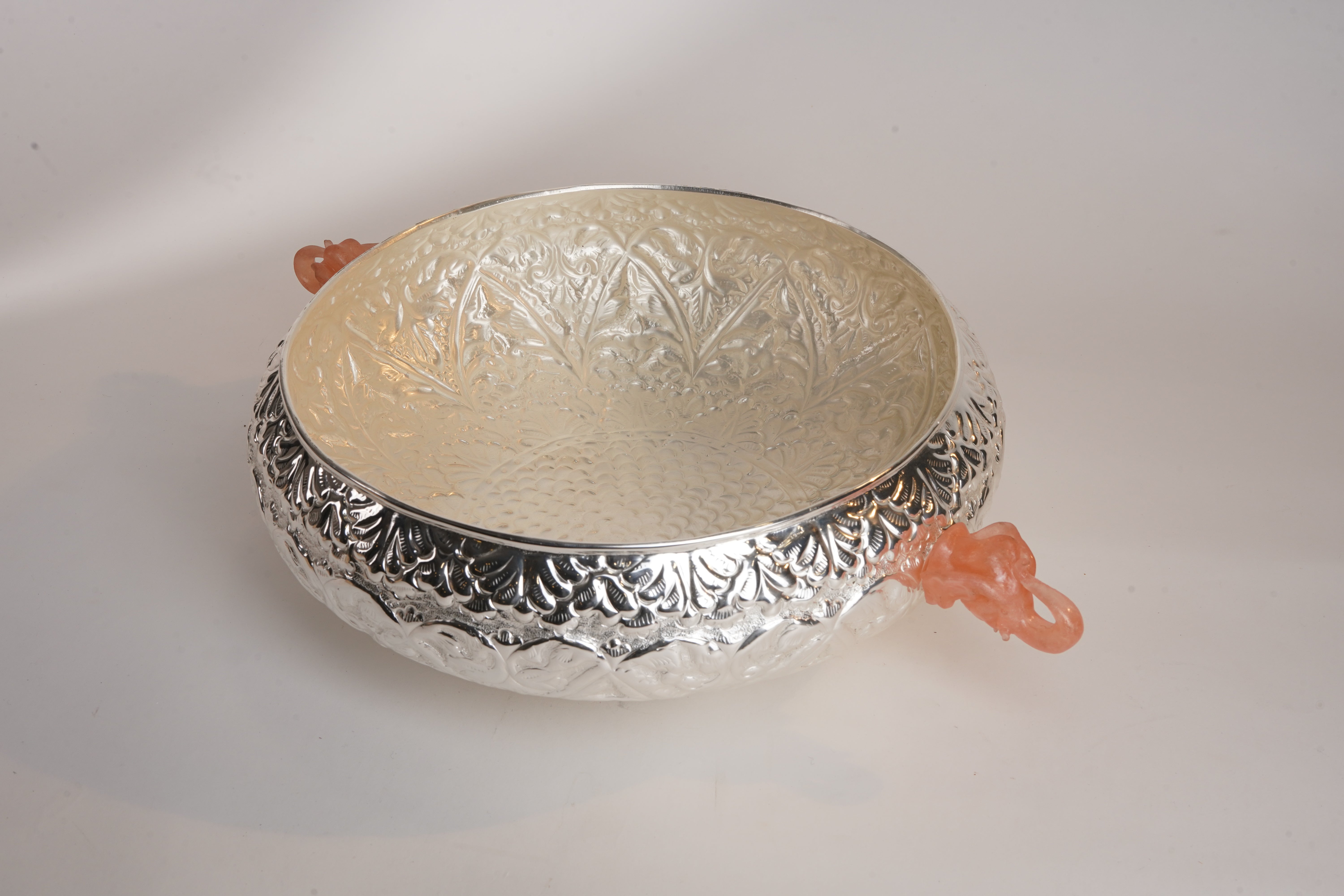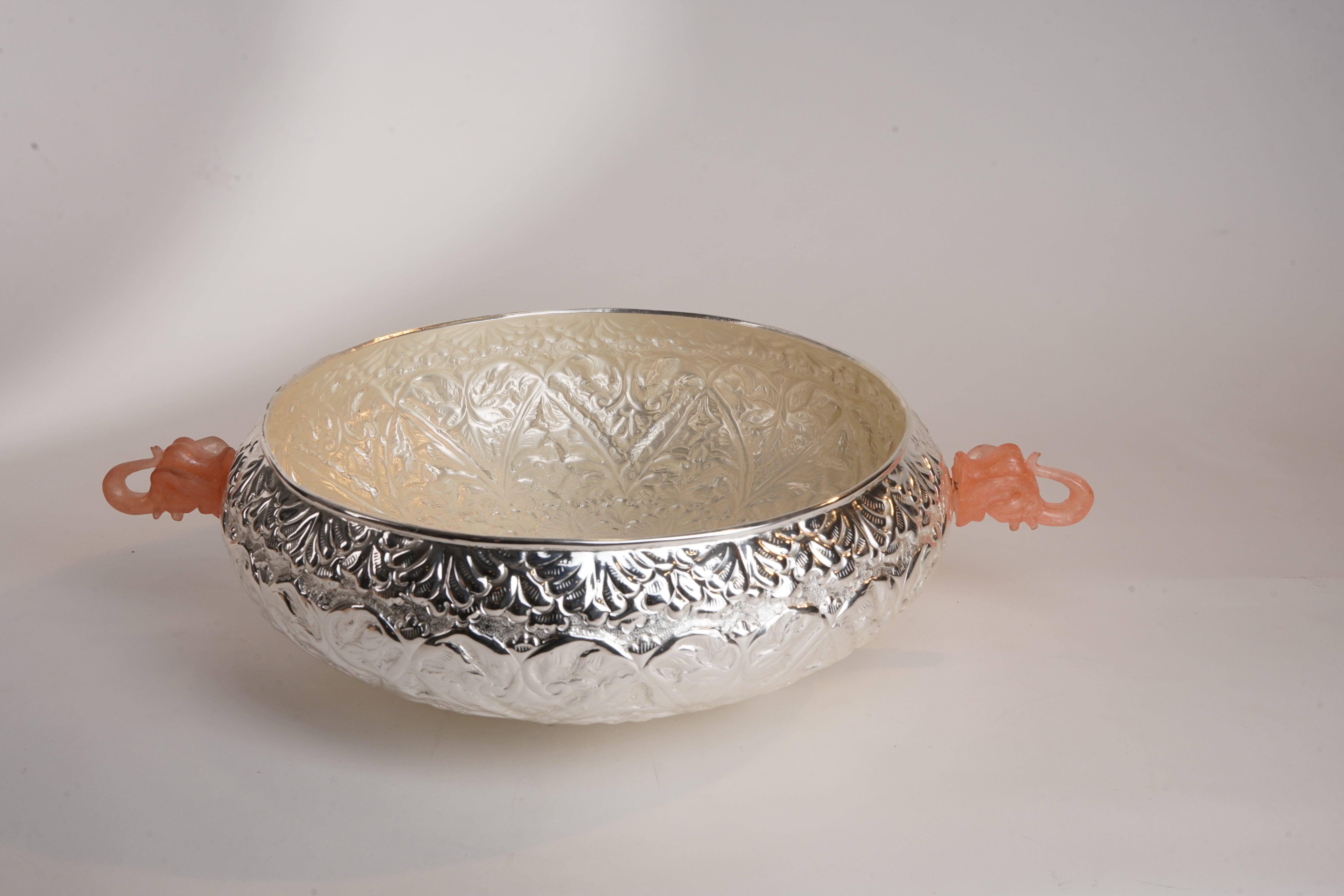 Make a bold statement with this exquisite silver-plated urli bowl, intricately etched and crafted from high-quality brass. The eye-catching feature—charming coral-toned resin elephant handles—adds a regal and traditional charm to this decor piece. Perfect for floating flowers, potpourri, festive setups, or as a luxurious gift item. The ornate inner design reflects timeless Indian craftsmanship, while the sturdy resin base offers durability. Comes elegantly packed in a swede utility box, ideal for weddings, Diwali gifting, or housewarming ceremonies.