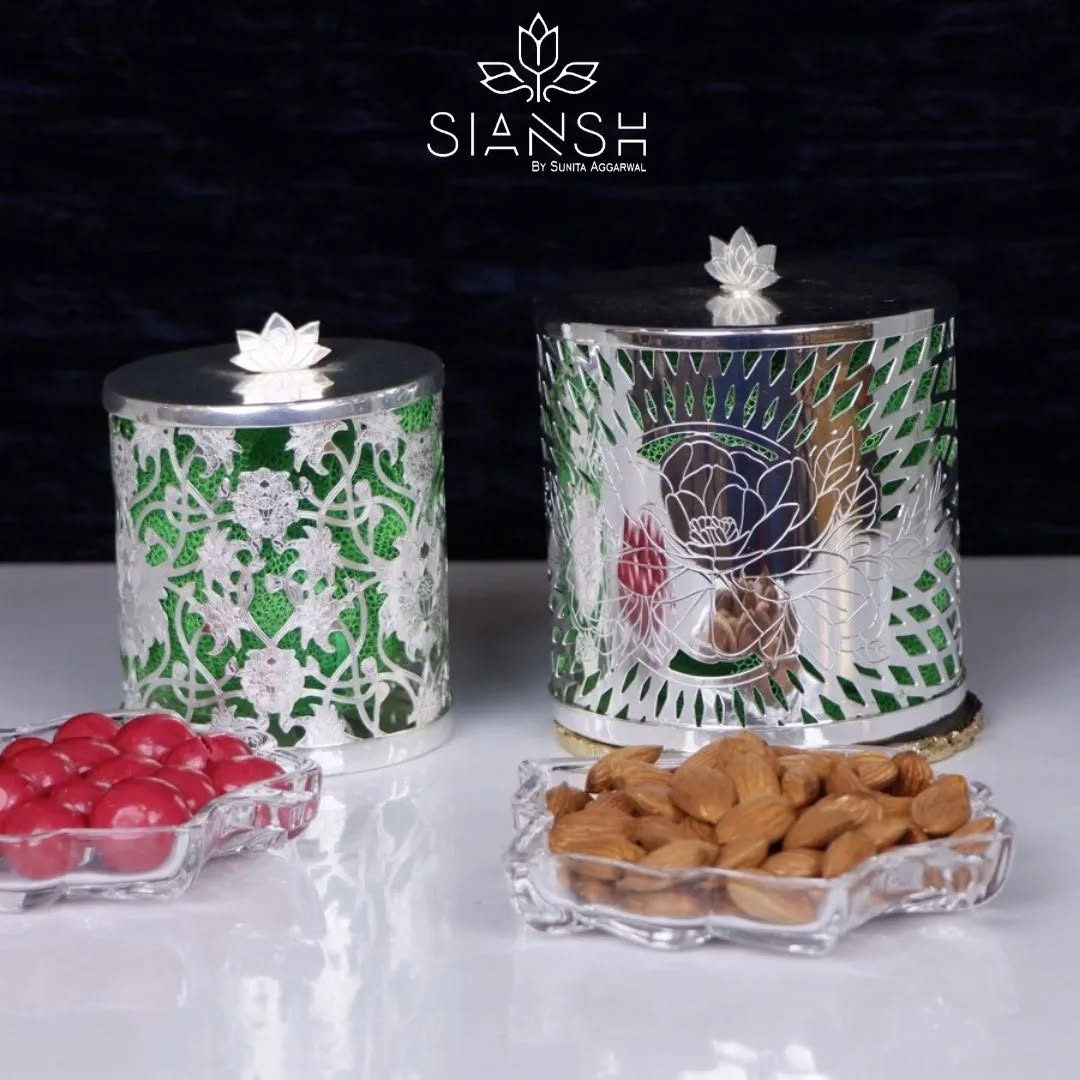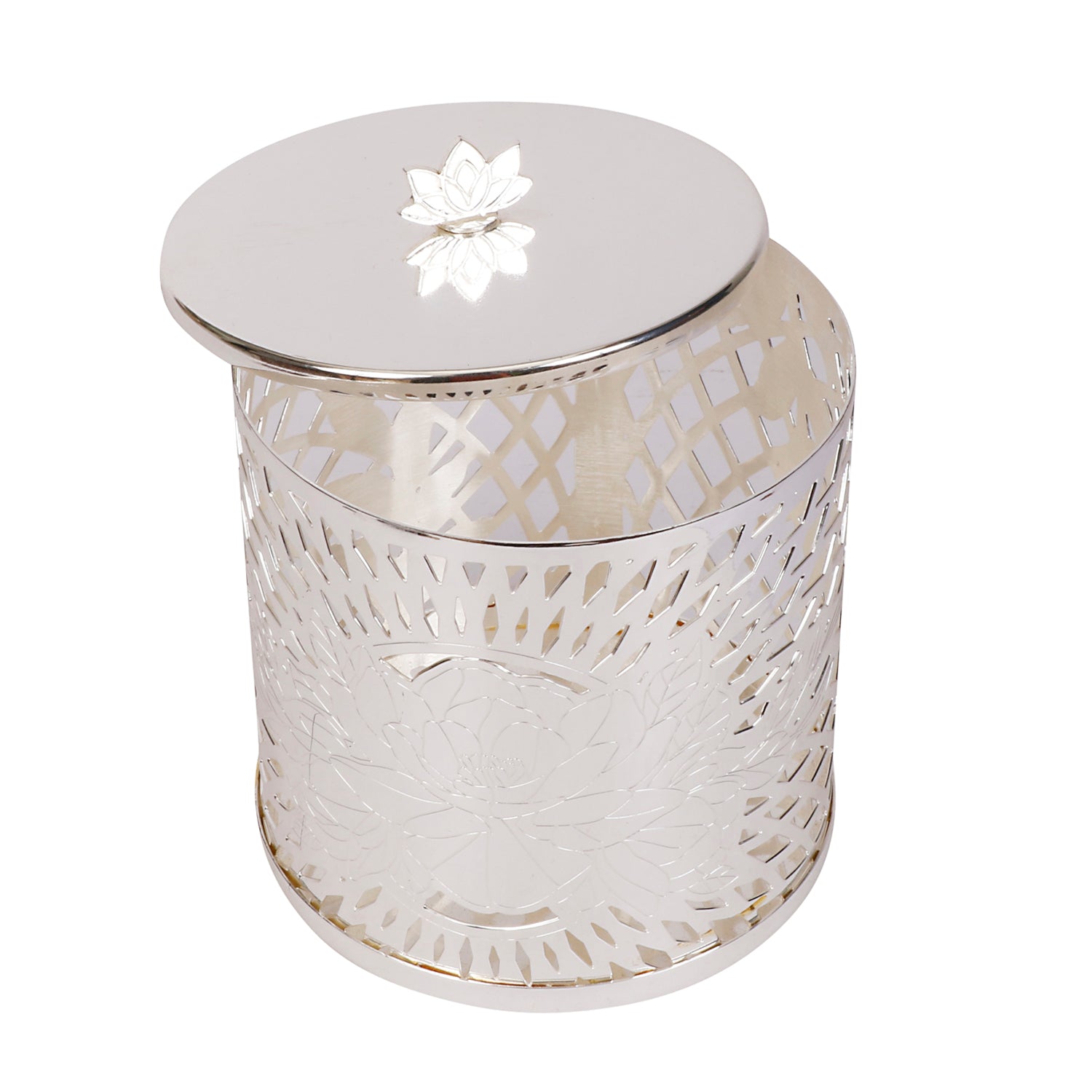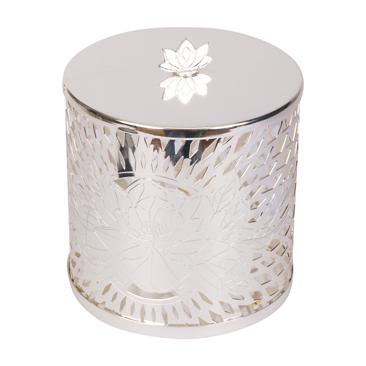 Elevate everyday essentials with the Silver Plated Container by Siansh, a symbol of functionality wrapped in elegance. Made from brass with intricate cutwork, and finished with a silver-plated surface, this container features a resin bead lotus handle on the lid – giving it an exquisite, regal touch.