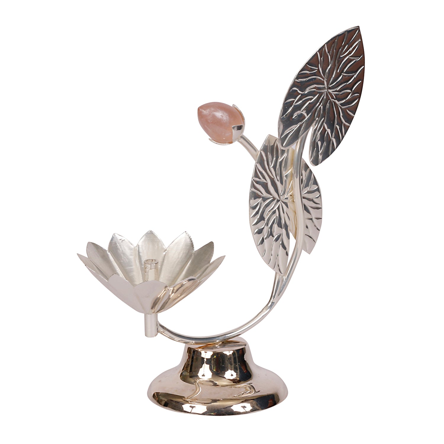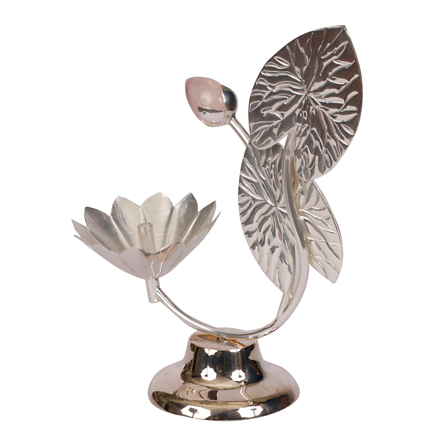 Perfect for daily pooja rituals, console décor, or meditation setups, it exudes a calming charm that transforms any space into a sanctuary. Crafted from brass and coated with silver plating, it features a sturdy base and a floral bud detail to enhance its aesthetic appeal.