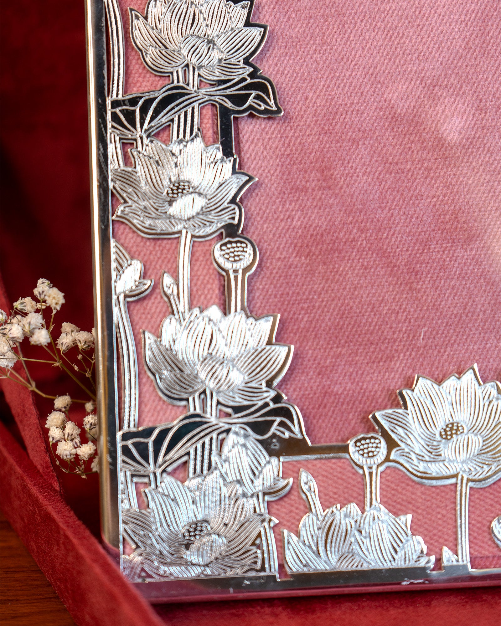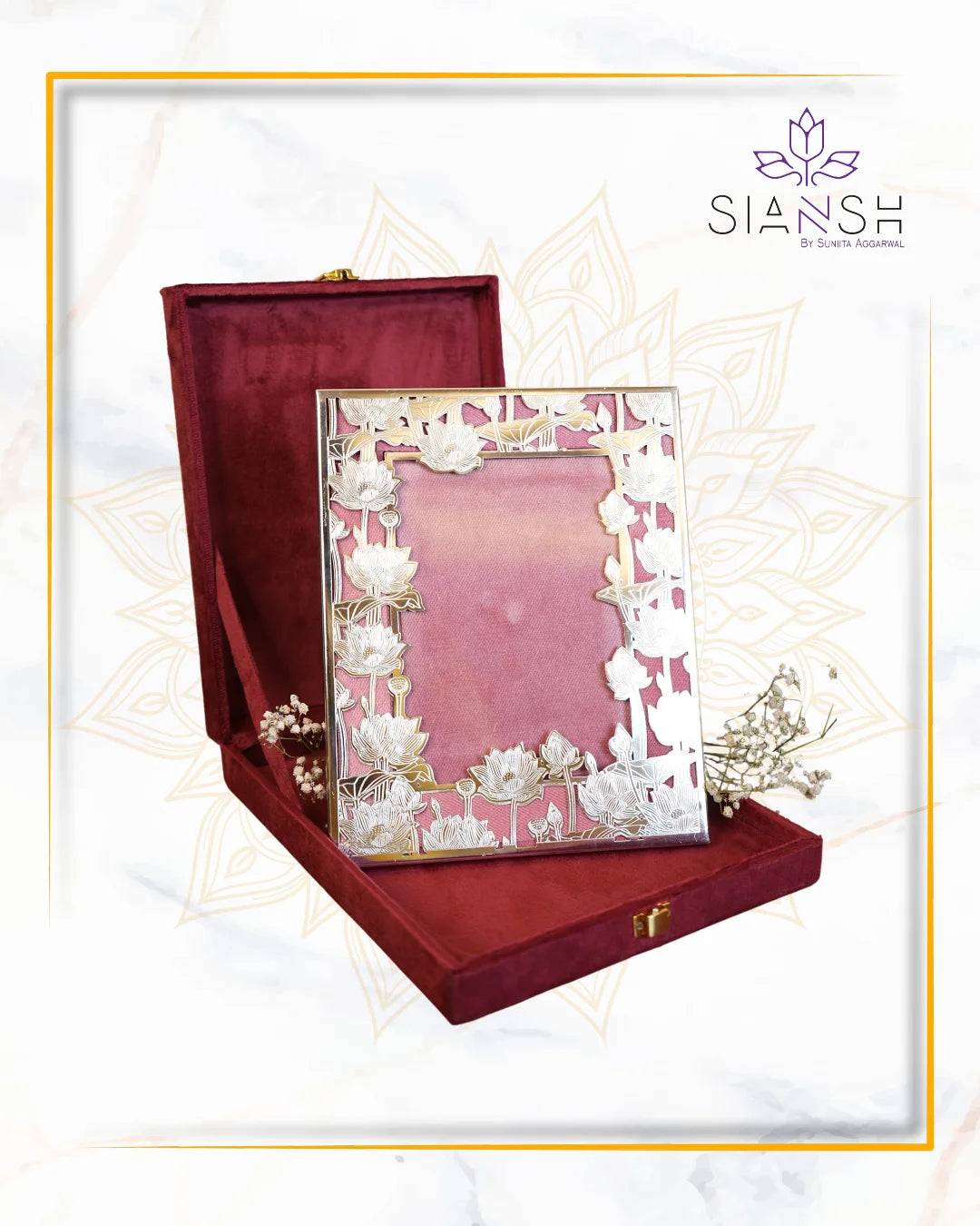 Capture and cherish life’s most special moments with this intricately crafted silver-plated photo frame, adorned with a serene lotus motif. Its delicate detailing and polished finish bring a sense of calm luxury, while the soft rose velvet background adds a romantic touch. Thoughtfully packed in a premium maroon swede box, this frame makes for an unforgettable gift at weddings, anniversaries, milestone birthdays, or high-end corporate events. More than décor, it’s a keepsake designed to hold memories close to the heart.