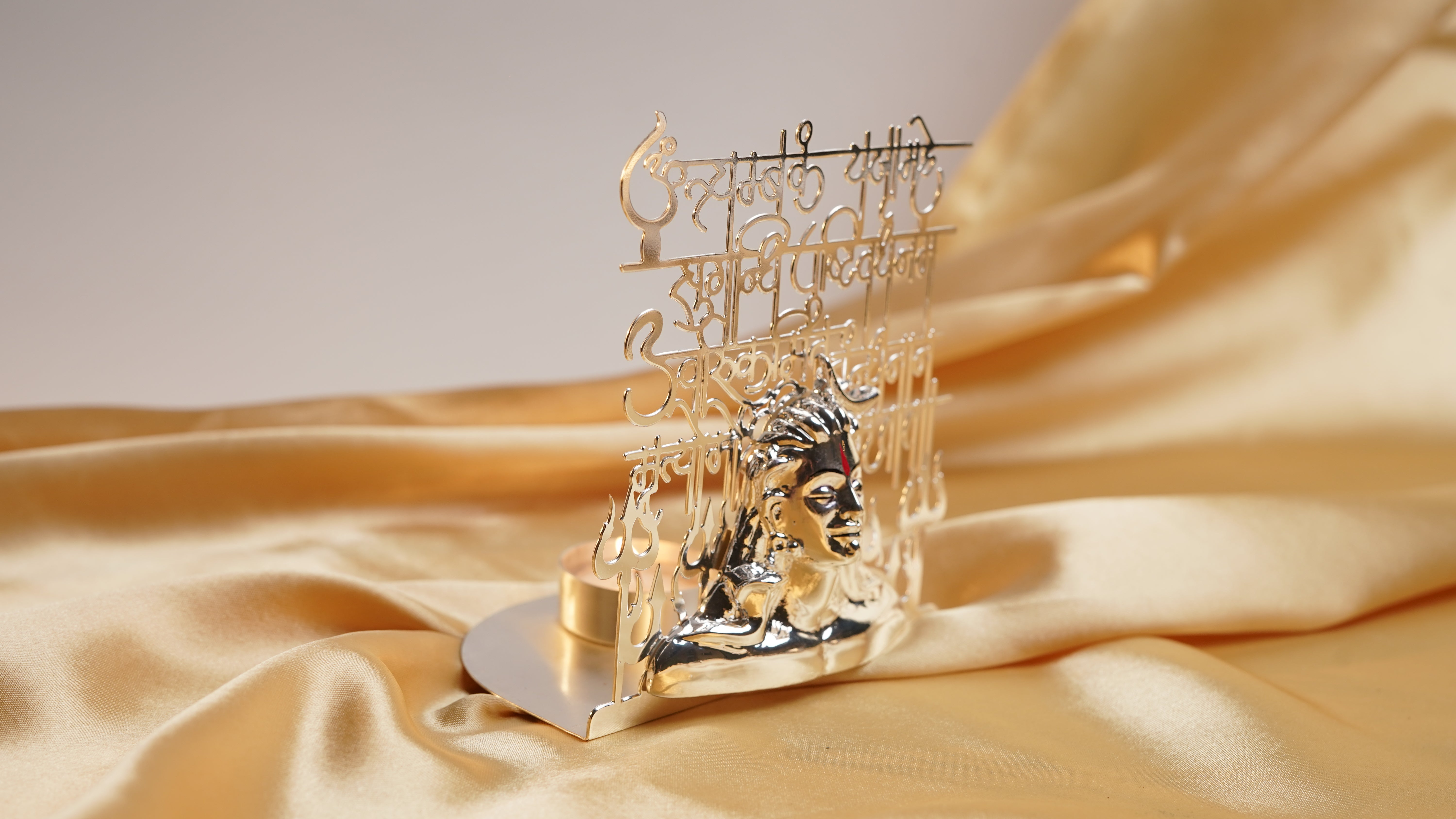 Invoke blessings and serenity with this exquisitely crafted silver-plated Maha Mrityunjay T-light artifact. Featuring the sacred mantra in elegant script and a finely sculpted bust of Lord Shiva, this piece blends devotion with décor. Designed to sit gracefully on a console or center table, the artifact adds spiritual charm to modern interiors. Light a diya behind it for a divine glow that highlights the mantra. An ideal choice for festive gifting, spiritual occasions, or sacred home styling — beautifully packed in a luxurious swede utility box.