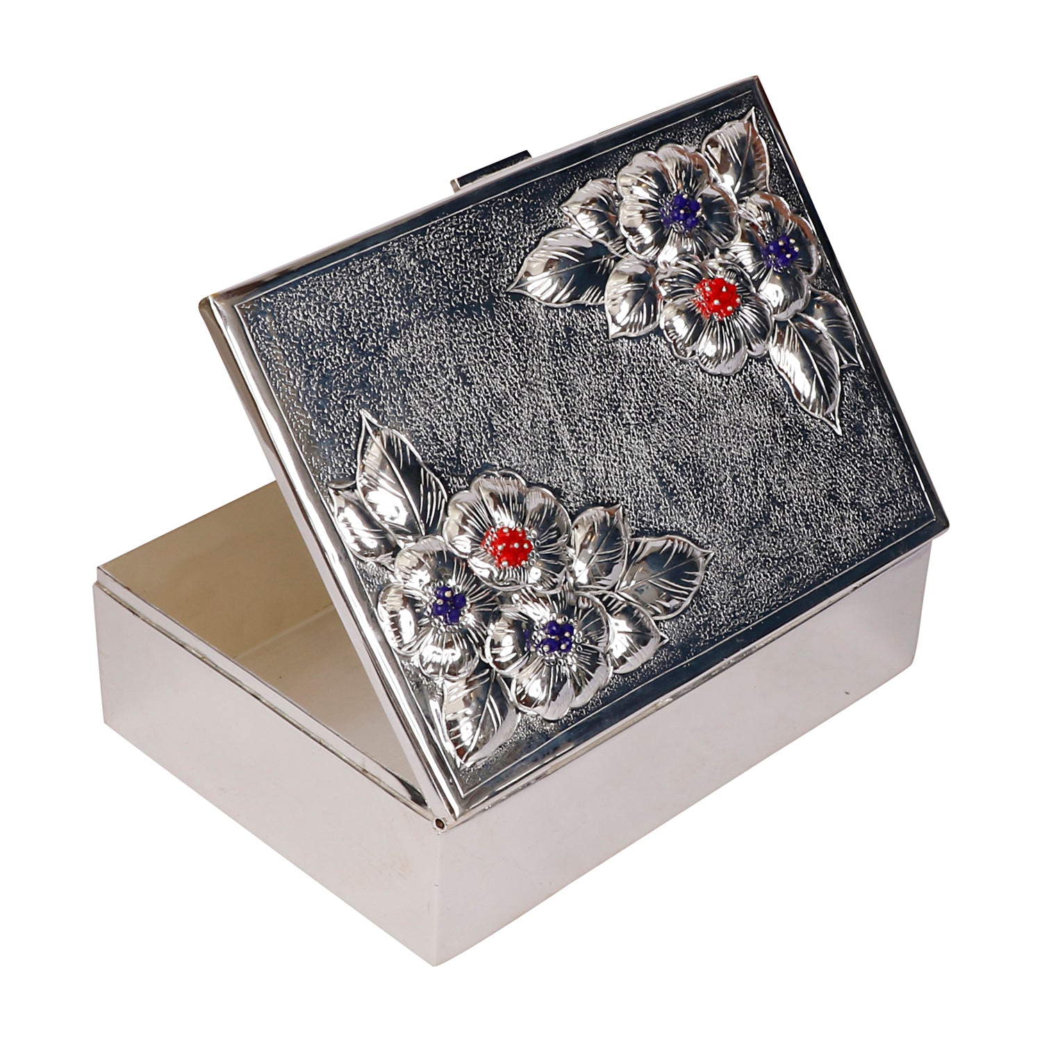 Elevate your gifting experience with this Silver Plated Rectangular Box with Stones by Siansh. Crafted in brass and adorned with intricate floral embossing and multicolor bead accents, this 10x9 inch box is the perfect blend of elegance and utility.