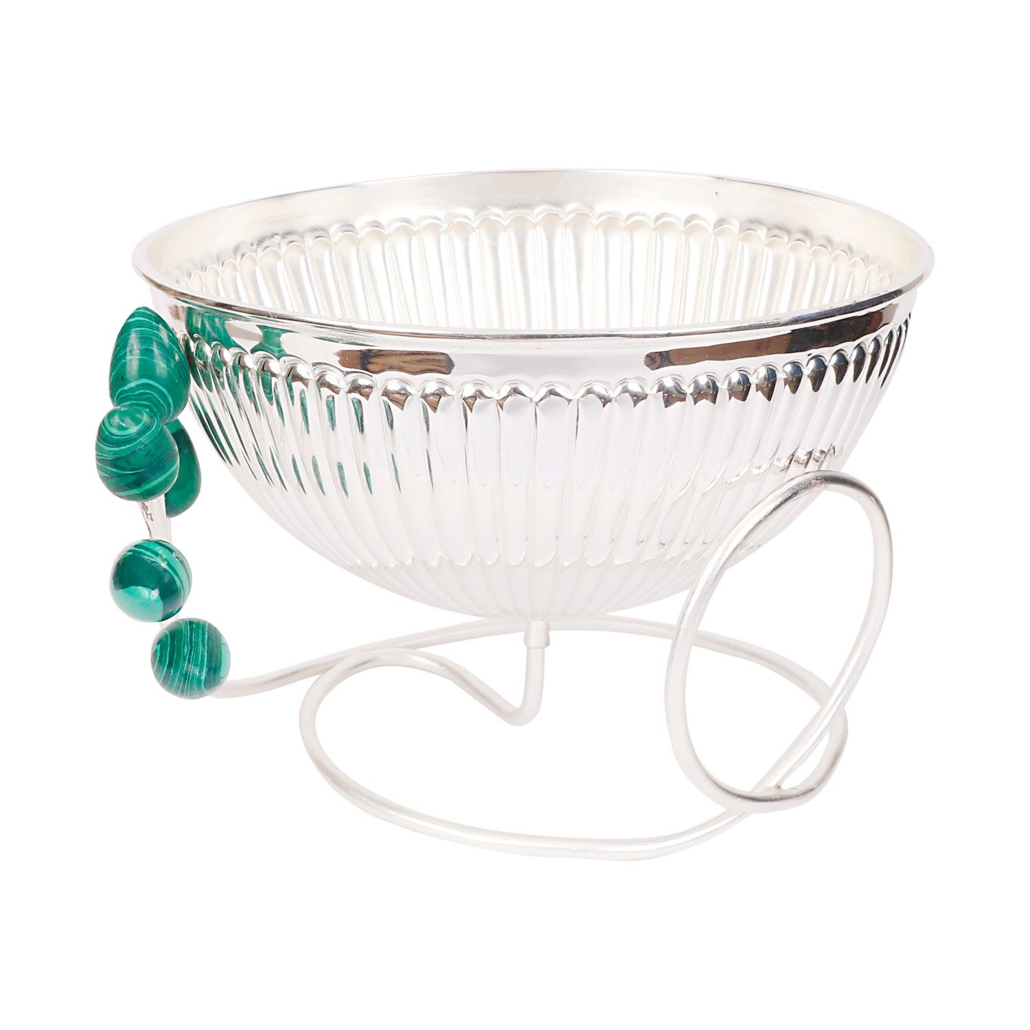 Add a touch of timeless elegance to your table with the Silver Plated Round Ribbed Wire Bowl by Siansh. Crafted from high-quality brass and plated in radiant silver, this bowl features an eye-catching ribbed texture and decorative green resin bud accents that resemble blooming nature.